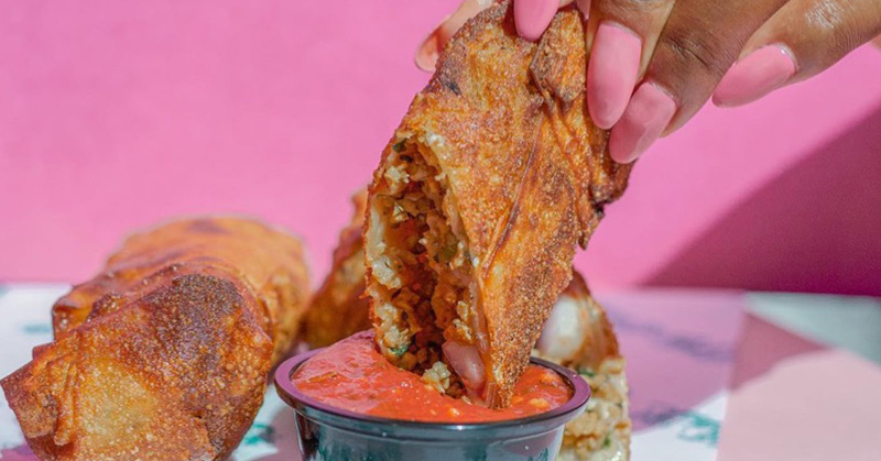 This vegan food truck offers an insanely innovative dish that the plant-based food scene has been lacking—loaded egg rolls! The crave-worthy rolls are available in Philly cheesesteak, pizza, and cheeseburger flavors. There’s even a dessert rendition filled with peach cobbler with a side of date caramel sauce.