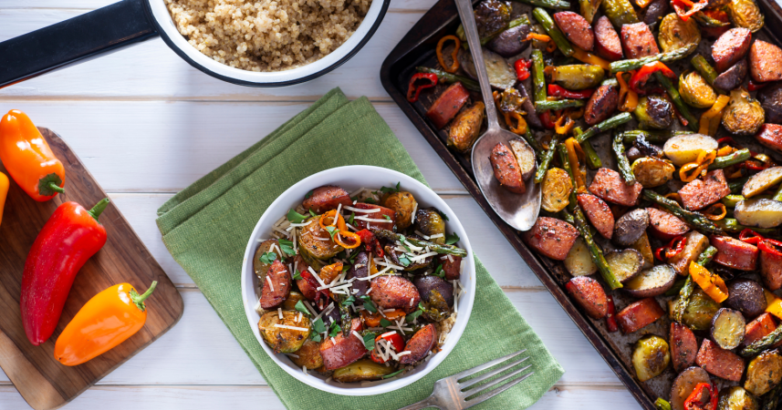 This dinner taught me to stop underestimating vegetables. Chop whatever you have into similar sized pieces. Sweet potatoes, cauliflower, Brussels sprouts, red onion, bell peppers. Toss with olive oil, salt, and pepper. Roast at 425°F until everything gets those caramelized edges, usually around 25 to 30 minutes.