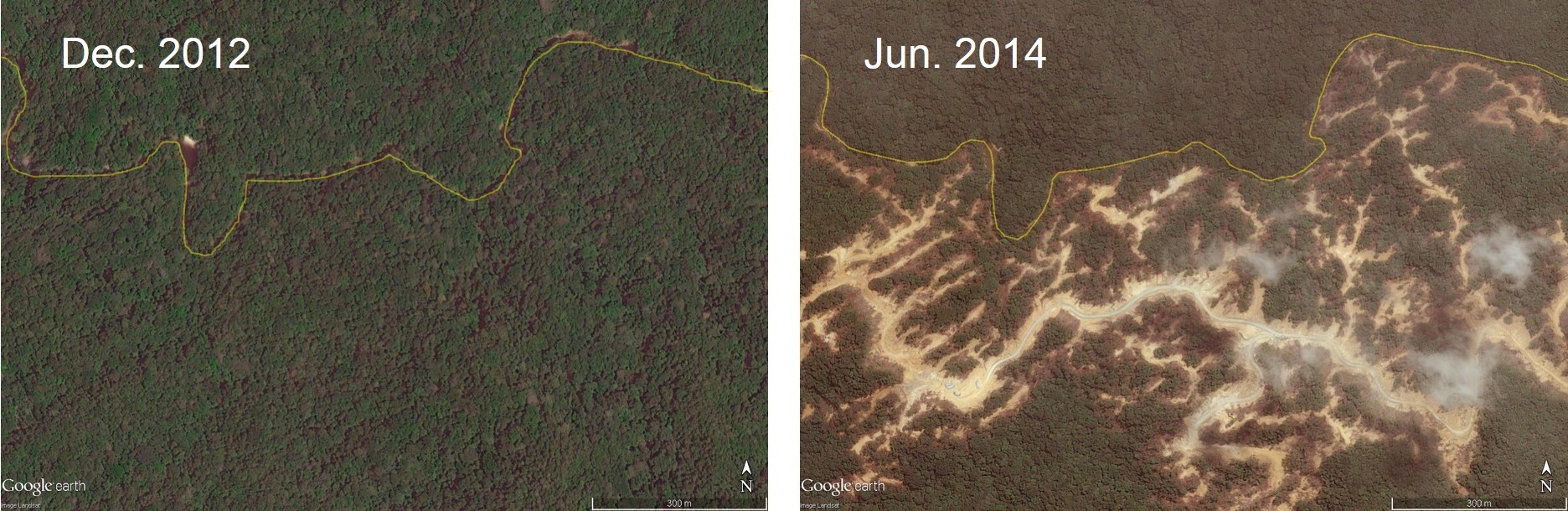 Satellite images of deforestation in Sarawak, according to Google Earth.